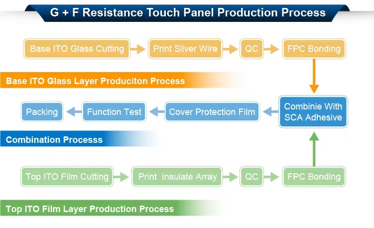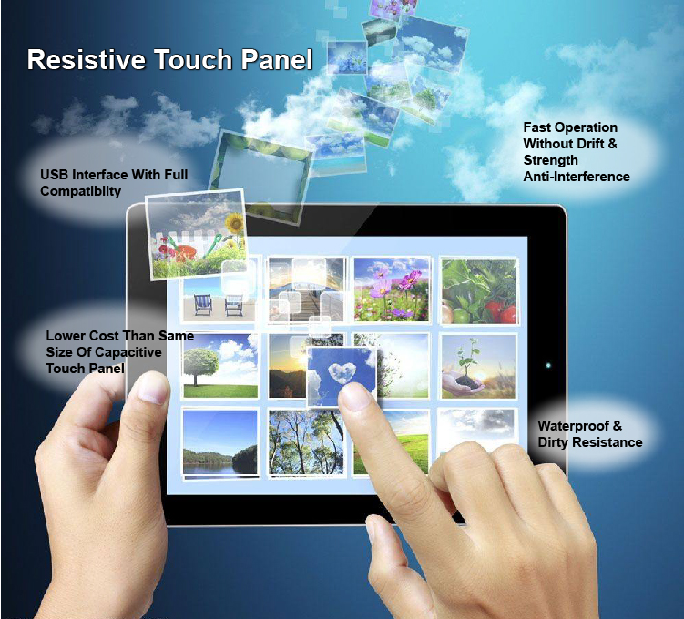Resistive touch screen/panel(TP) includes 4 wires, 5 wires & 8 wires. Their structure is two layers including top and base layer. The top payer is PET and the base layer is glass. We call it P+G structure. Bother the PET & glass have the ITO coating(conducting coating) on their contiguous surface. Different wires Res TP will have different performance. It depends on different engineering requirement. We can produce different Res TP with different wires, size and performance under clients’' customization as well as the Res TP cover. Any color or logo on the cover can be customized and printed. Our Res TP also can be provided the USB diver board for customer easy application. Customers only need to know what they want and we will produce what they need.