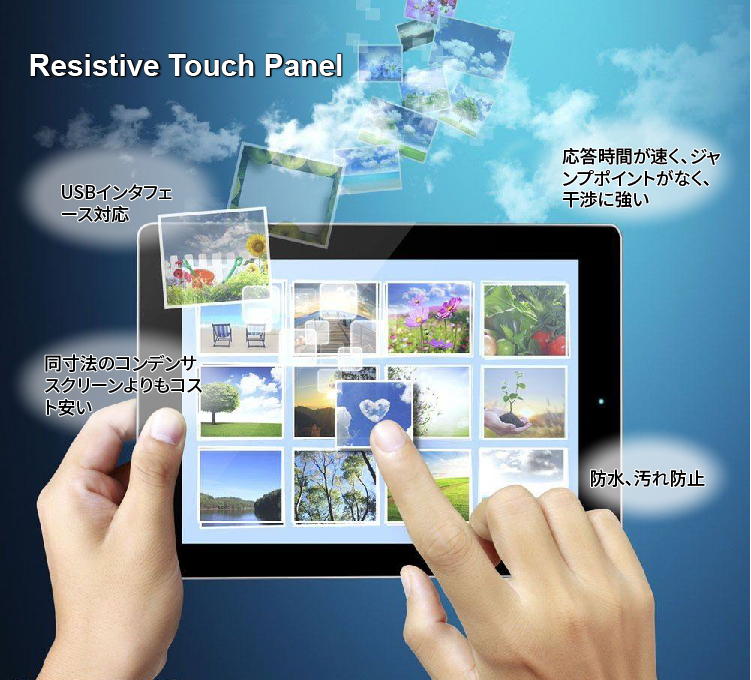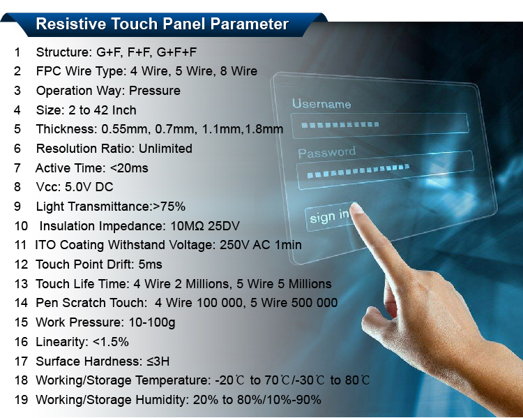 抵抗性タッチスクリーンは4線、5線、8線を含む。彼らは基本的にトップとボトムを含む2層構造である。最上階はPETで、下地も下地はガラスと呼ばれています。この構造はP+Gと呼ばれています。このPETとガラス表面にはITOの導電性コーティングが施されており、彼らの導電層は正面に貼り合わせられており、中央には無数の小さなバンプが両面コーティングされており、PET表面に圧力がかかると、点圧の位置でPETフィルムが底ガラスの導電層に変形して接触し、この接触点が導電して電流信号を発生する。抵抗スクリーンの線数は異なり、性能も異なり、線数が大きいもの、性能が安定すればするほどコストも高くなり、これは実際の工事とコストの必要に応じて選択されます。CTはお客様に異なる線数、サイズ、厚さ、表面印刷の抵抗スクリーンをカスタマイズすることができます。私たちの抵抗スクリーンはUSBのコントローラを提供することもできます。お客様はカスタマイズのニーズを持ってCTに知らせるだけで、設計のために適切な抵抗性タッチスクリーンを生産します。