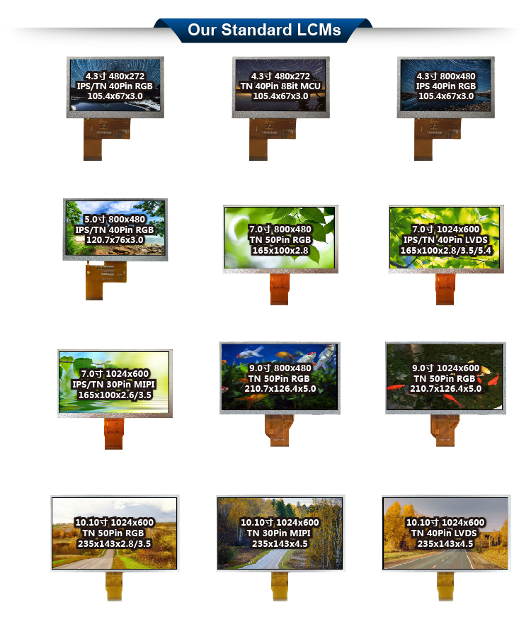 CTは顧客に異なるサイズ、コントラスト、輝度、解像度のLCD/TFTの液晶モジュールを提供し、サイズは2.5 ~ 40インチから選択できる。パネルのインタフェースにはLVDS、SPI、EDP、Mipi、RGBなどがあります。私たちの液晶パネルガラスはすべてBOE、群創、天馬などの元工場のAゲージガラスから直接購入しています。チップICはすべて新品で中古と在庫品ではなく。すべてのパネルは1年間の品質保証を提供しており、生産問題の場合は、1年以内に無料で交換し、往復運賃を負担します。