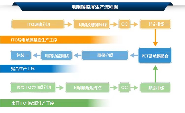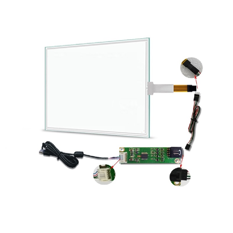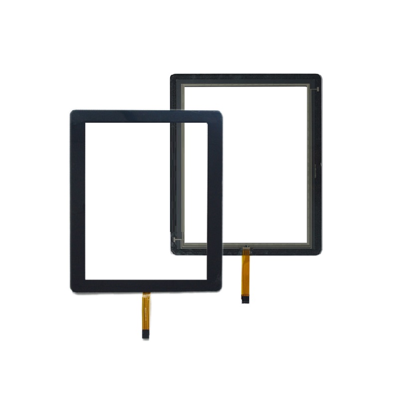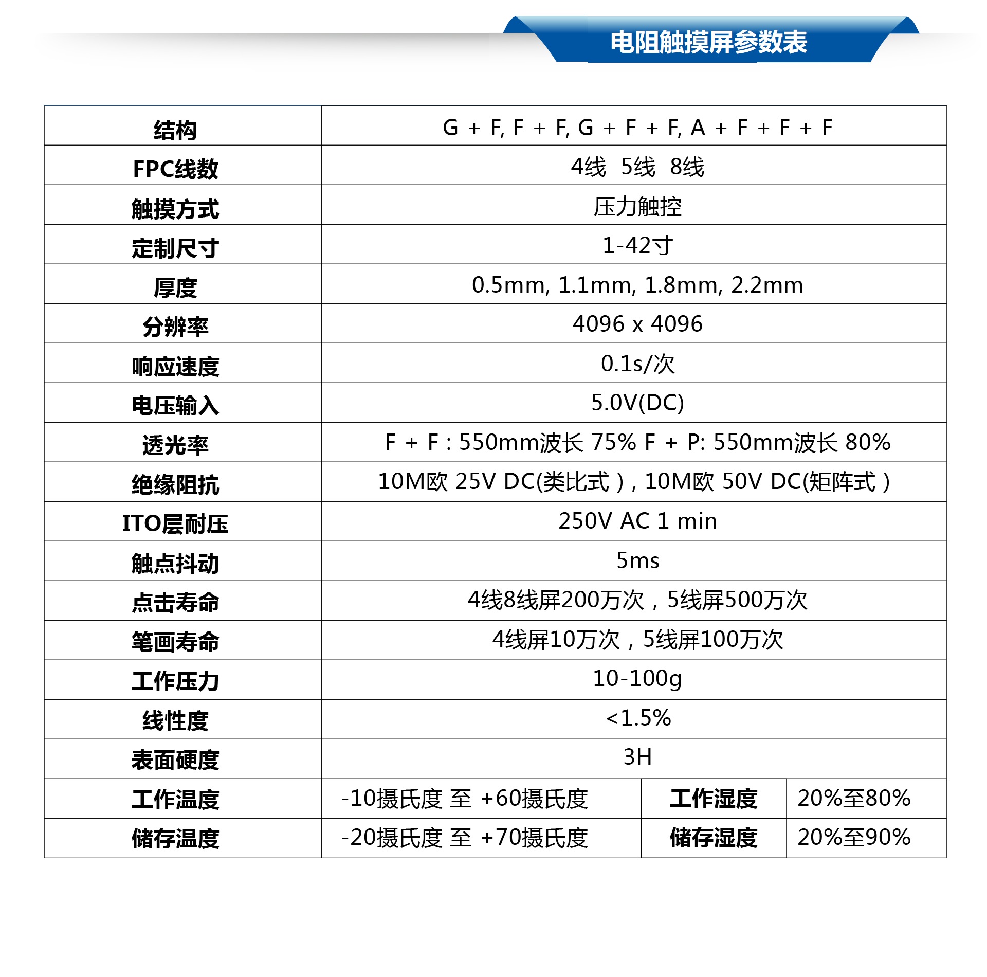 电阻触摸屏包括4线,5线和8线。他们基本上都是两层结构包括顶层和底层。顶层是PET的,底层也叫基底是玻璃的。这种结构叫P+G。这PET和玻璃表面都是有一层ITO的导电涂层的,他们的导电层是正对着贴合,中间有无数的小凸点分隔开两面涂层的,等有压力在PET表面是时,点压的位置PET膜就会形变接触到底玻璃的导电层从而该接触点导电产生电流信号。电阻屏的线数不一样,性能也不一样,线数大的,性能越稳定成本也越高,这个根据实际的工程和成本需要进行选择的。CT可以为客人定制不同线数,尺寸,厚度和表面印刷的电阻屏。我们的电阻屏也可以提供USB的控制器。客户只有要有定制需求并告知CT,我们就为给设计,生产出合适需要的电阻触摸屏。